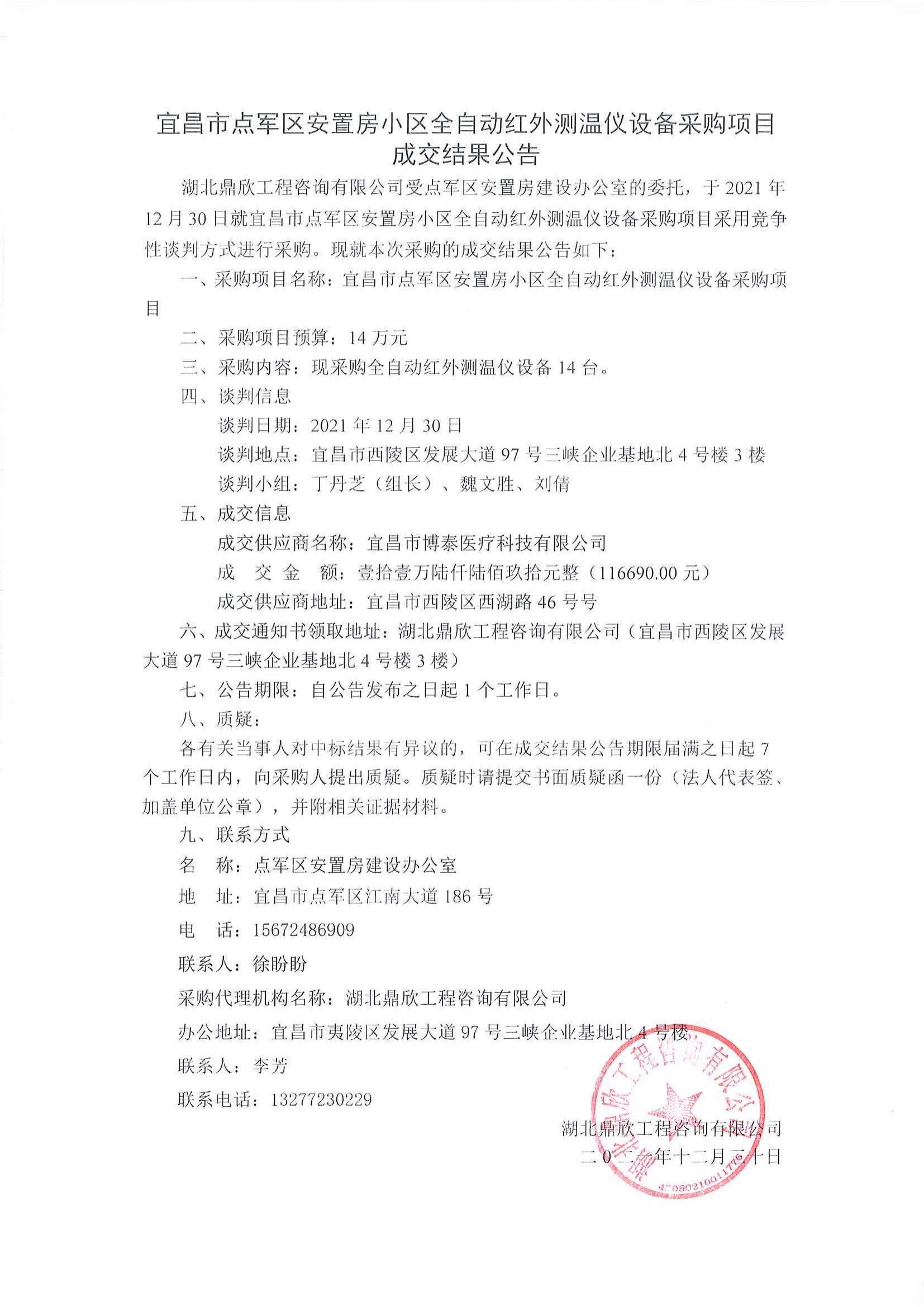 宜昌市點(diǎn)軍區(qū)安置房小區(qū)全自動(dòng)紅外測(cè)溫儀設(shè)備采購項(xiàng)目成交公告