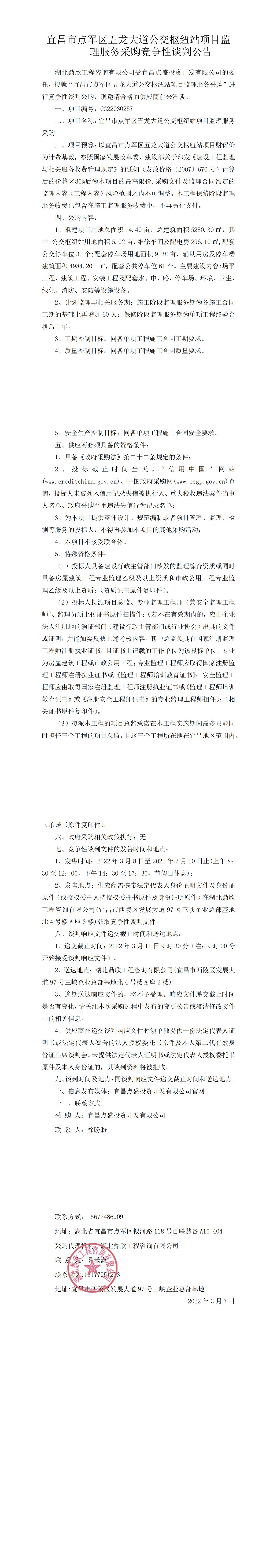 宜昌市點軍區(qū)五龍大道公交樞紐站項目監(jiān)理服務采購競爭性談判公告