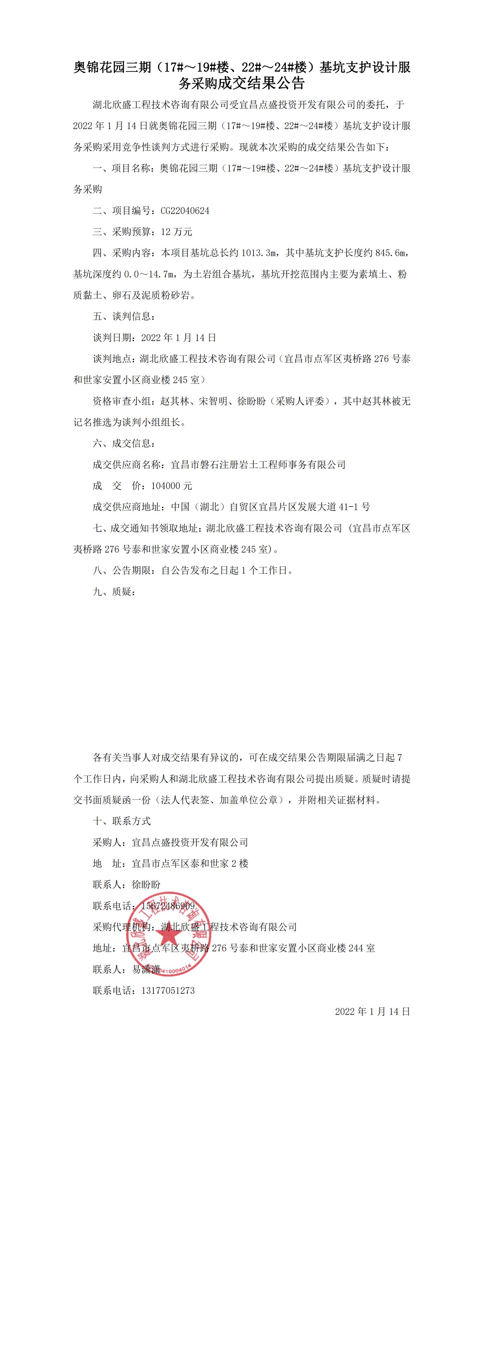 奧錦花園三期(17#~19#樓、22#~24#樓)基坑支護設(shè)計服務(wù)采購成交結(jié)果公告
