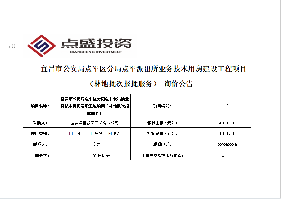 宜昌市公安局點軍區(qū)分局點軍派出所業(yè)務(wù)技術(shù)用房建設(shè)工程項目 (林地批次報批服務(wù)) 詢價公告