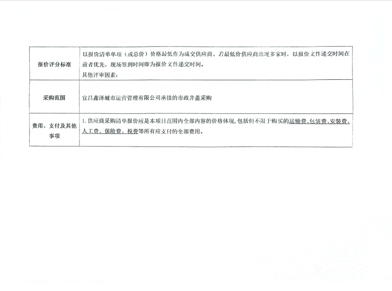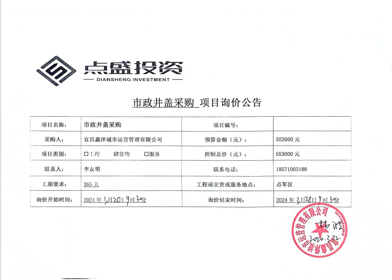 宜昌鑫澤城市運(yùn)營管理有限公司市政井蓋采購項(xiàng)目詢價(jià)公告