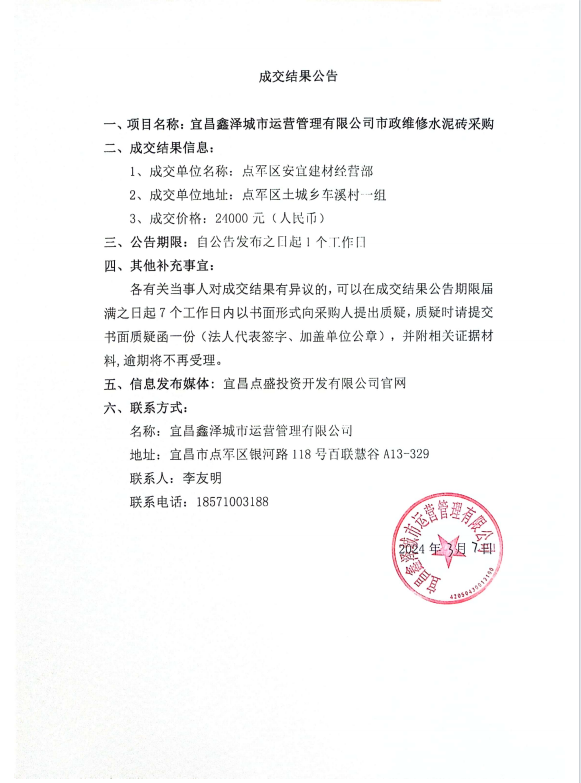 宜昌鑫澤城市運(yùn)營管理有限公司市政維修水泥磚采購項(xiàng)目成交公告
