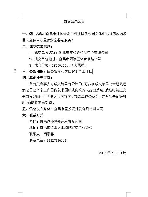 宜昌市外國語高中科技樓及校園文體中心維修改造項(xiàng)目(交體中心屋頂安全鑒定服務(wù))成交公告