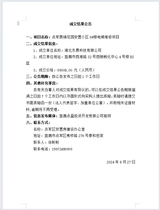 點(diǎn)軍奧錦花園安置小區(qū)6#樓電梯維修項(xiàng)目成交公告