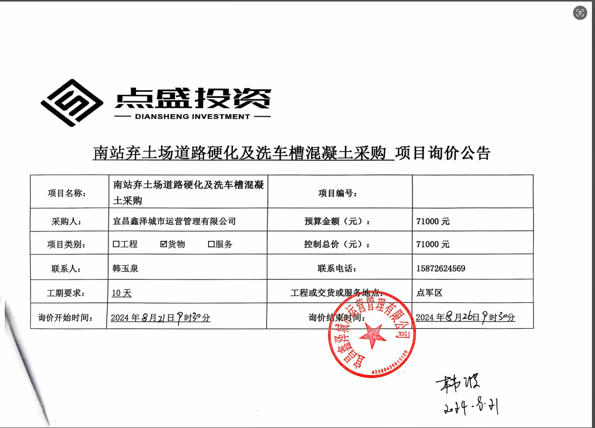 宜昌鑫澤城市運(yùn)營(yíng)管理有限公司南站棄土場(chǎng)道路硬化及洗車槽混凝土采購項(xiàng)目詢價(jià)公告