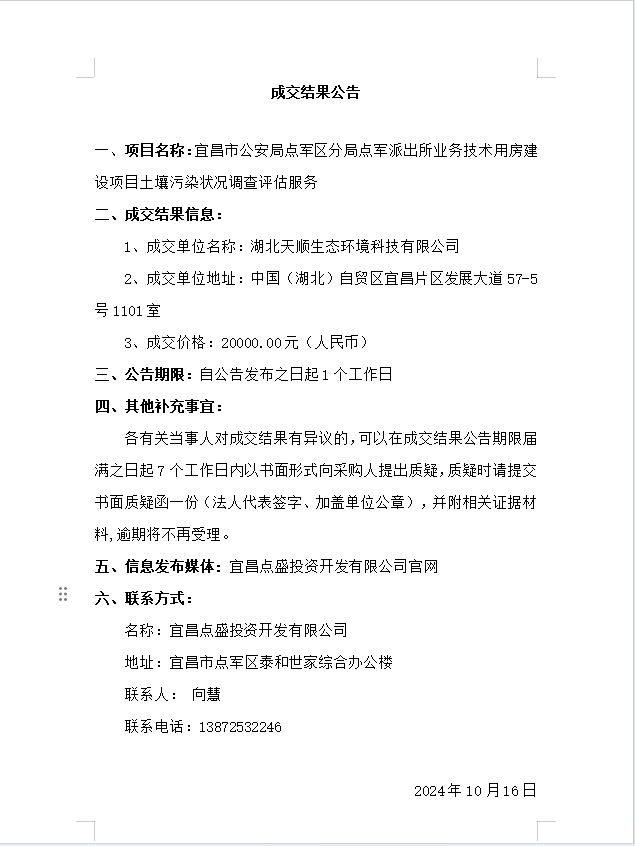 宜昌市公安局點(diǎn)軍區(qū)分局點(diǎn)軍派出所業(yè)務(wù)技術(shù)用房建設(shè)項(xiàng)目土壤污染狀況調(diào)查評(píng)估服務(wù)成交公告