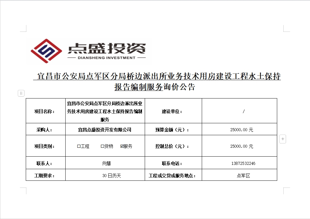 宜昌市公安局點軍區(qū)分局橋邊派出所業(yè)務(wù)技術(shù)用房建設(shè)工程水土保持報告編制服務(wù)詢價公告