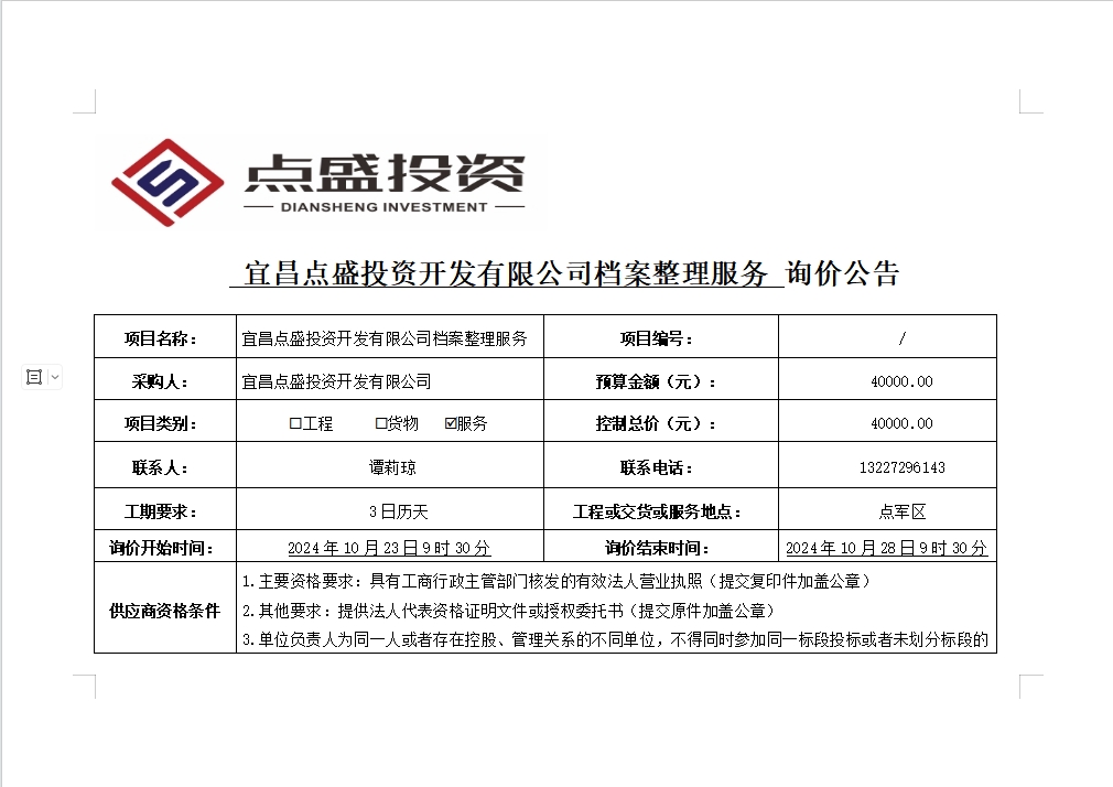 宜昌點(diǎn)盛投資開(kāi)發(fā)有限公司檔案整理服務(wù)詢價(jià)公告