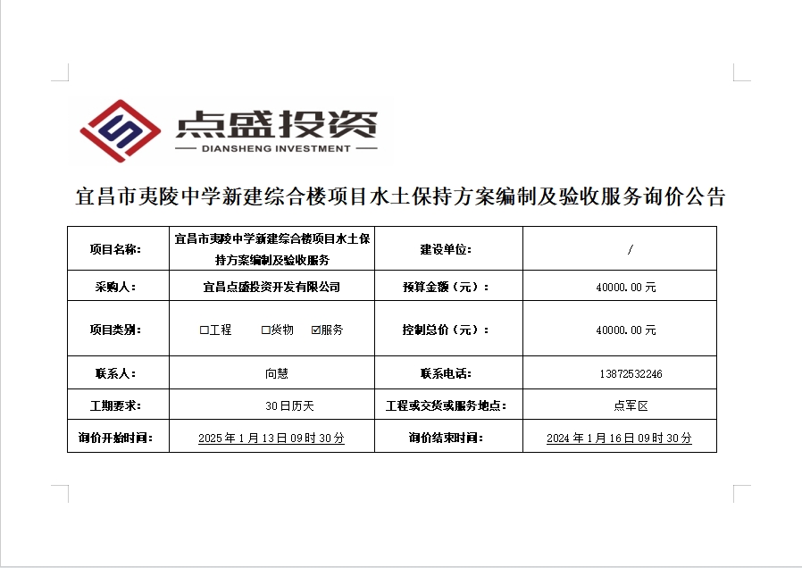 宜昌市夷陵中學(xué)新建綜合樓項(xiàng)目水土保持方案編制及驗(yàn)收服務(wù)詢價(jià)公告